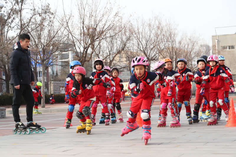 12月23日,河北唐山路北区实验小学,同学们正在体育类特色课上进行轮滑学习和训练。据介绍,为进一步落实“双减”政策,该校在减少作业量的同时,引导老师积极开设各类特色课,丰富学生校内活动的形式和内容。目前老师申报的特色课分为益智类、体育类、语言类、艺术类、科技类、团建类、非遗类,共计7个类别,43个项目。学校计划将趣味特色课进一步延伸到校外,解决网络游戏、娱乐视频等占据学生大量课后时间的问题。李霞/摄