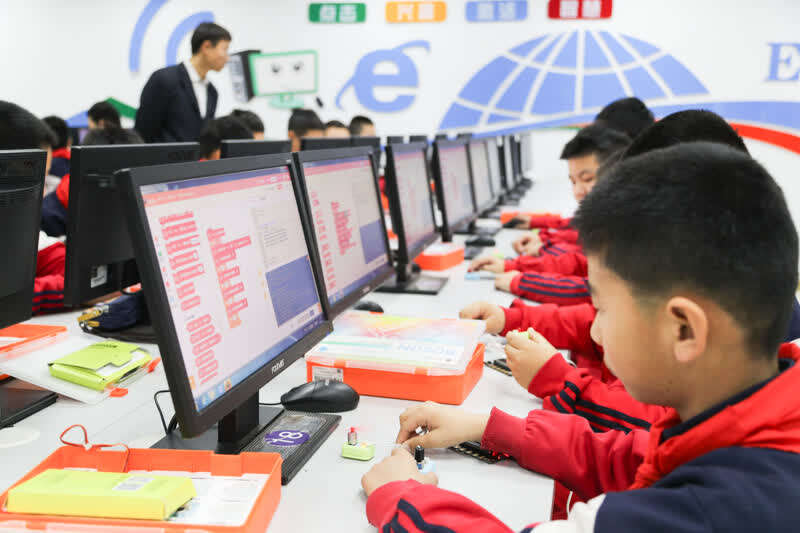 12月23日,河北唐山路北区实验小学,同学们在特色课程上进行编程学习。李霞/摄
