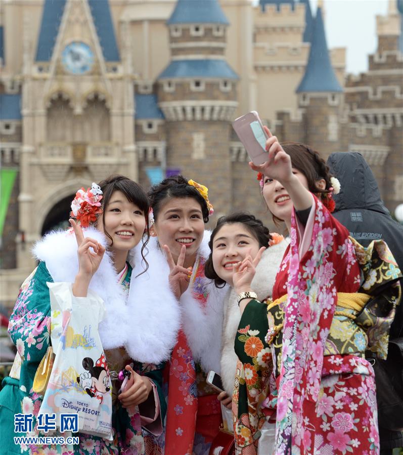 1月9日,在日本东京迪士尼乐园,几名身穿和服的女子参加“成人节”庆祝活动。每年1月的第二个星期一,日本年满20周岁的青年男女都要欢度“成人节”,庆祝自己成年。 新华社记者马平摄