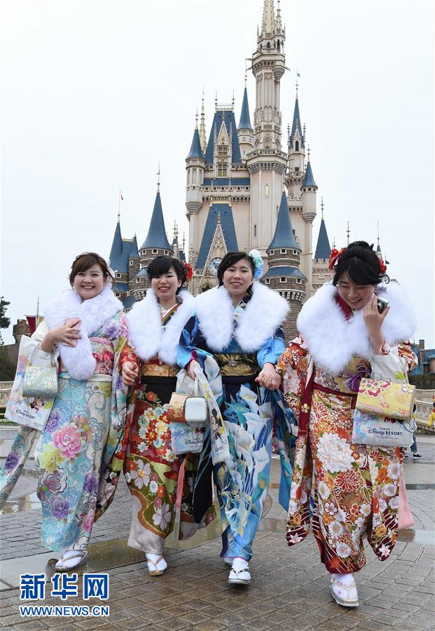 1月9日,在日本东京迪士尼乐园,身穿和服的日本女子参加“成人节”活动。每年1月的第二个星期一,日本年满20周岁的青年男女都要欢度“成人节”,庆祝自己成年。新华社法新