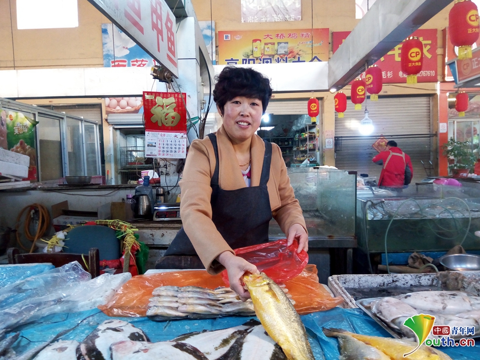 青岛市胶州市湖州路市场的鱼贩刘桂丽已经出现在夜色中,她先拉开卷帘门,将灯拿出,在夜色中挑起了那似星点的灯光,然后顾不上歇息一口气,就忙碌着搬运货物,进去,出来,一趟又趟,直到摆好了货物。她接着便戴上大襟,打开保鲜鱼的货物箱子,将手伸进了因为天气寒冷而结冰碴子的水中,将鱼从箱子中捞出,放在台子上。昏暗的灯光中,在旁边的架子上,一双单薄的手套被风吹动,遗忘在角落里。