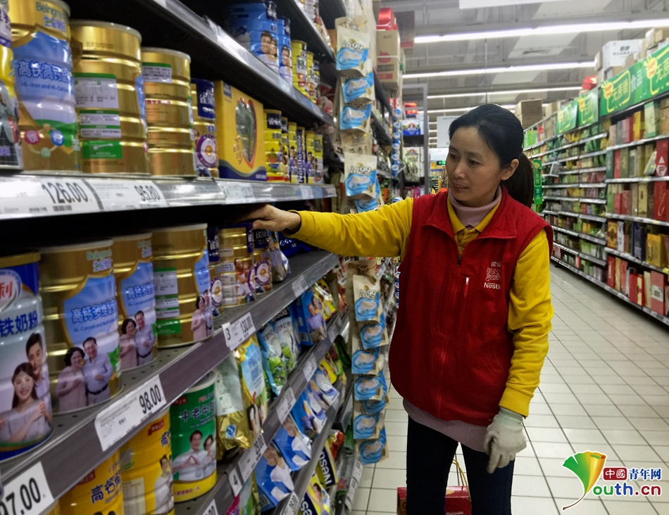 记者在采访余工秀的时候,她正推着加货的手推车,从超市仓库取货回来,准备将满满一车的奶粉放到相对应的货架上。“过年啦,大家都来买吃的,零食区销量最好,我这边奶粉卖得也不错。”余工秀笑着说,“我们的工作就是看到哪边货架空了,就赶紧去超市补货,保证货架上的货源充足,让来买年货的人高高兴兴来,心满意足地走。” 中国青年网通讯员 潘翔宇 供图