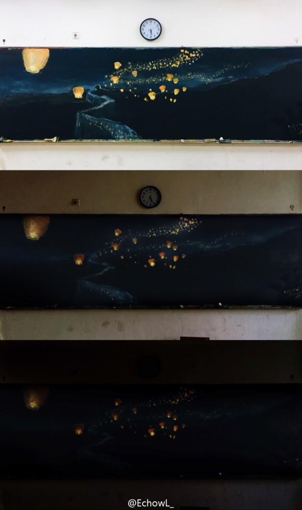 她是班上的宣传委员,两年时间里,她已经画了七八幅黑板报。雄伟绵延的长城、漫天的孔明灯……张艺谋电影《长城》中的一幕被她搬到了黑板报上。她还突发奇想的在水粉画中加入了荧光涂料,让这幅黑板报在不同光线下,甚至黑夜里,都能呈现惊艳之感。这幅黑板报出来后,3张不同光线下的画在老师学生的群里疯传,大家都特别喜欢。
