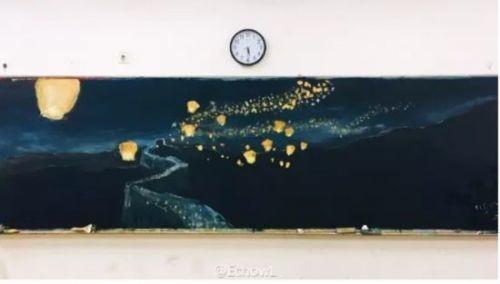 她说看完电影后,就一直很想画孔明灯。有一次她网购颜料,碰巧搜索到荧光材料。脑海中灵光一闪,她觉得这种材料很有用处!“画长城是从下午3点多一直画到天黑,画的时候满脑子都是‘但使龙城飞将在,不教胡马度阴山’。”杨童婳说,随着天色一点一点暗下来,荧光效果显现,出乎意料。后来有一次班上放电影,关灯后班上同学都特意回头看。而她把黑板报发到网络上,竟然收了1万多个赞。