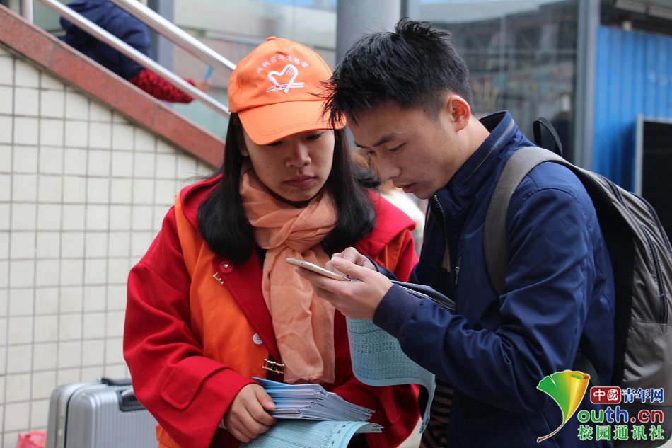 为了每一个人以后都能自己网上订票更方便出行。教乘客买票,取票,订票都是志愿者们的家常便饭,春运首日,志愿者一起走进售票厅走近乘客为他们宣传春运以及相关知识。图为志愿者在教主动前来询问如何使用12306的路人使用该软件。中国青年网通讯员 王小珍 提供