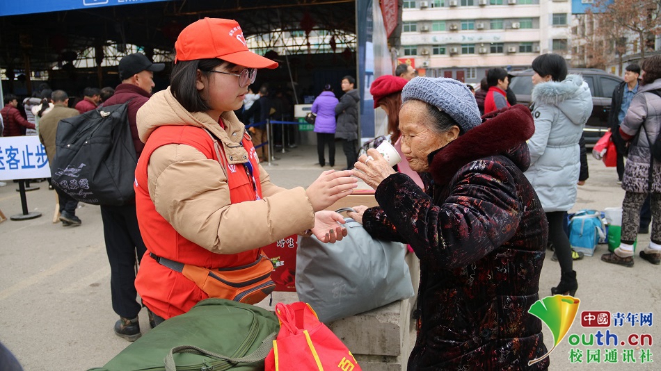 为让老人家觉得更温馨。在爱心小屋里执勤的志愿者看见对面的老人家守着大大小小的东西后便过去询问奶奶是否需要帮助,也许是不好意思说出口,志愿者折回去给奶奶倒了一杯热水,并陪着奶奶聊天。他们说,只是想让老人家觉得我们更温馨,更有爱。图为志愿者在给奶奶倒水。中国青年网通讯员 王小珍 提供