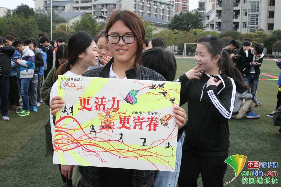 “更活力,更青春”,参赛同学展现自己班级的标语牌。 中国青年网通讯员 李燚 摄
