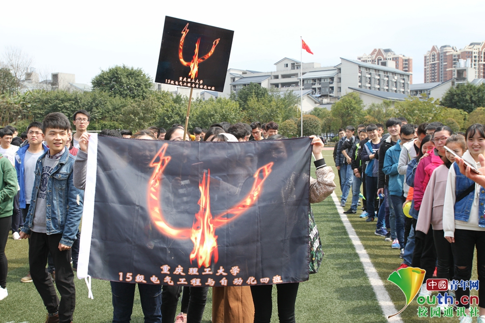 运动会开始前,参赛同学展现制作的班期。 中国青年网通讯员 李燚 摄