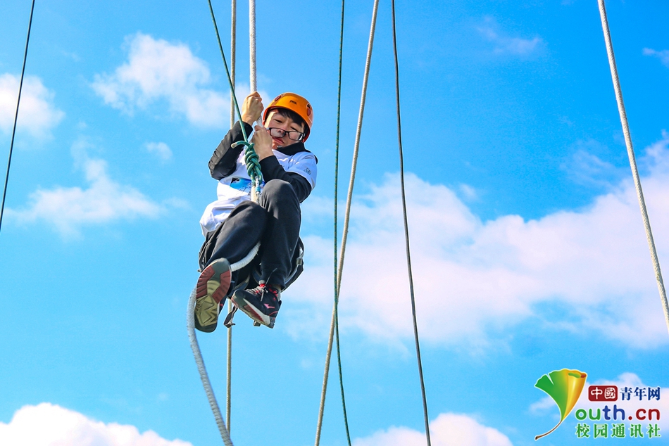 比赛选手在攀神比赛后缓慢下降,幷做出尴尬的表情。中国青年网通讯员 王壮 提供