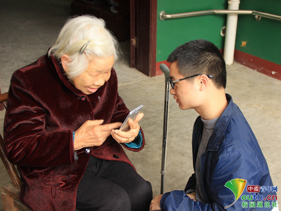 奶奶虽然年纪大了,看着志愿者手里的手机,不禁想起了在外地的儿女,想通过电话与他们聊聊天。中国青年网通讯员 詹玉兰 摄