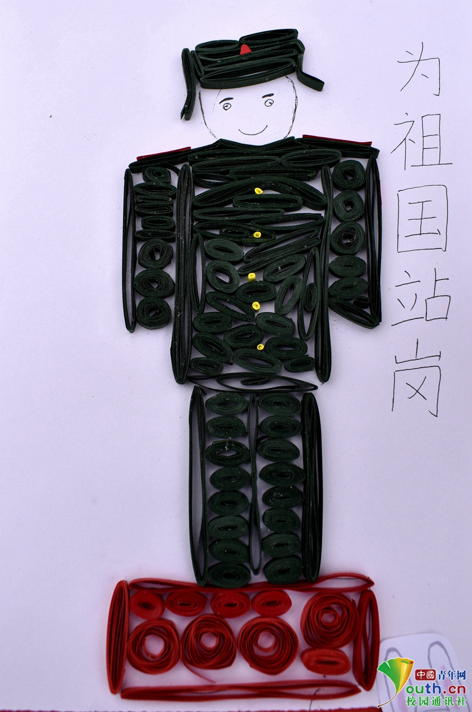 当我们享受假期的欢愉时,当我们感受与亲友相聚的快乐时,还有那么一群人无怨无悔地为祖国坚守着。参赛者用衍纸描绘出了位祖国默默奉献的边疆战士。川北医学院手工艺协会 供图