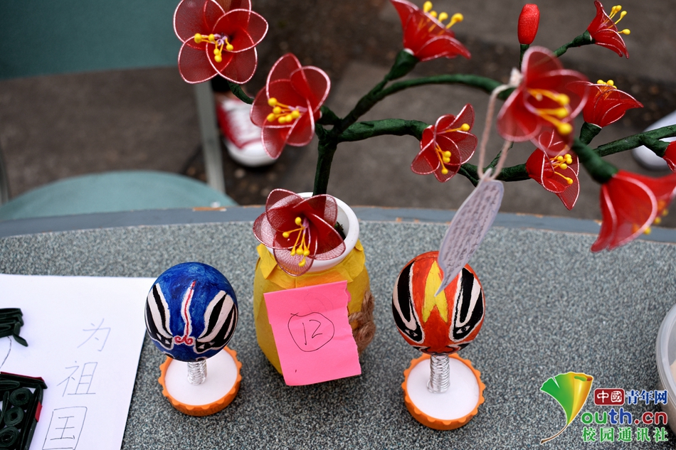 作品中央的用丝网做成的不败红花是一首献给所有保卫祖国的英雄的赞歌。两旁的脸谱用蛋壳制成,是对中华传统文化的传承。川北医学院手工艺协会 供图