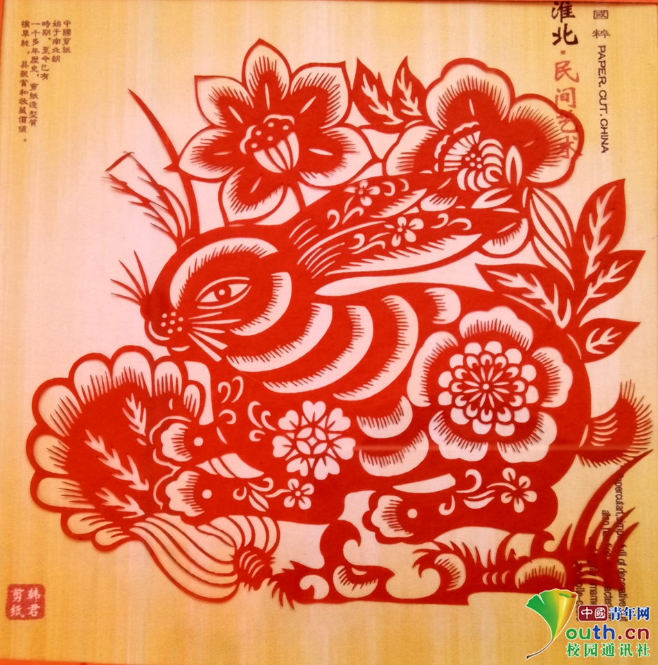 活灵活现的兔子剪纸。宗氏剪纸民俗特色浓重,生动自然。尤其是十二生肖剪纸作品让同学们大饱眼福。中国青年网通讯员 程晓琳 摄