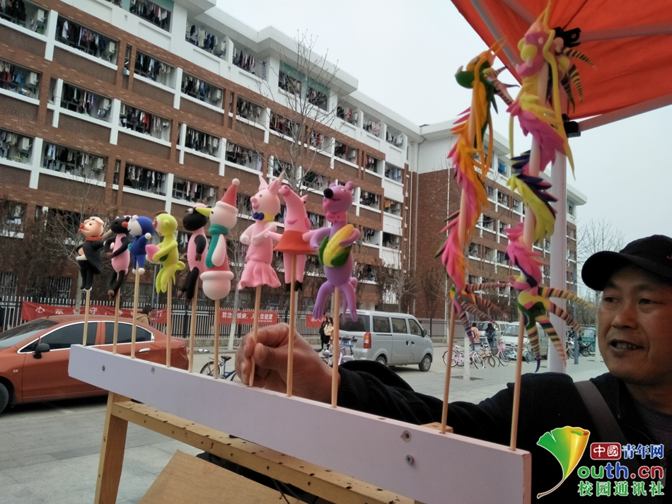 泥人文化展览。叮当猫、龙、猪、兔子等可爱生动的泥制动物,老艺人一点点细致地刻画,吸引了同学们前来欣赏与购买。中国青年网通讯员 程晓琳 摄