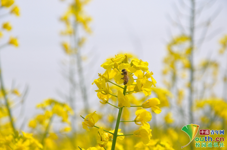 油菜花海里一只勤劳的小蜜蜂正在采蜜。中国青年网通讯员 周凯峰 摄