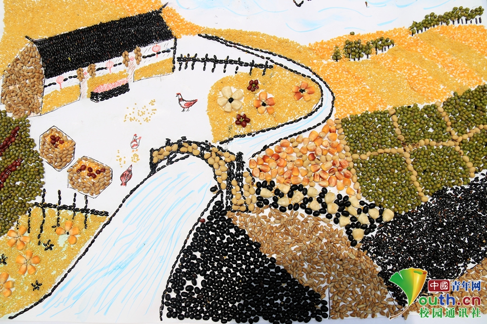一条小河宛如蓝色的绸缎蜿蜒开去,河的左岸坐落着一栋房屋,房上挂着一串串玉米和一个个红灯笼。门前的小院里载有树木和许多鲜花,两三只鸡正在院子中嬉戏、啄米。一座小桥横跨在小河上,将河右岸的田野与小院连通。整个画面寓意着在现代科学技术的指导下进行科学生产的新农村所形成的一片生机勃勃、人与自然和谐相处的丰收景象。中国青年网通讯员 王钊铄 摄