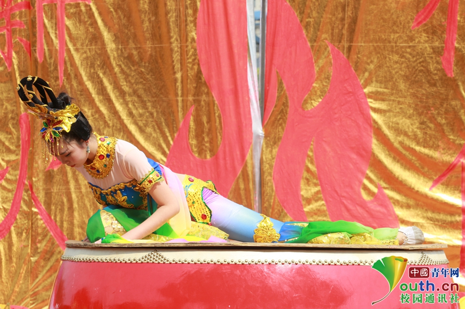 金色在这个美丽的春天里是最美好的颜色,鼓上的“孔雀”用曼妙的舞姿展示着当代大学生的朝气与蓬勃。 中国青年网通讯员 邹俞华 摄