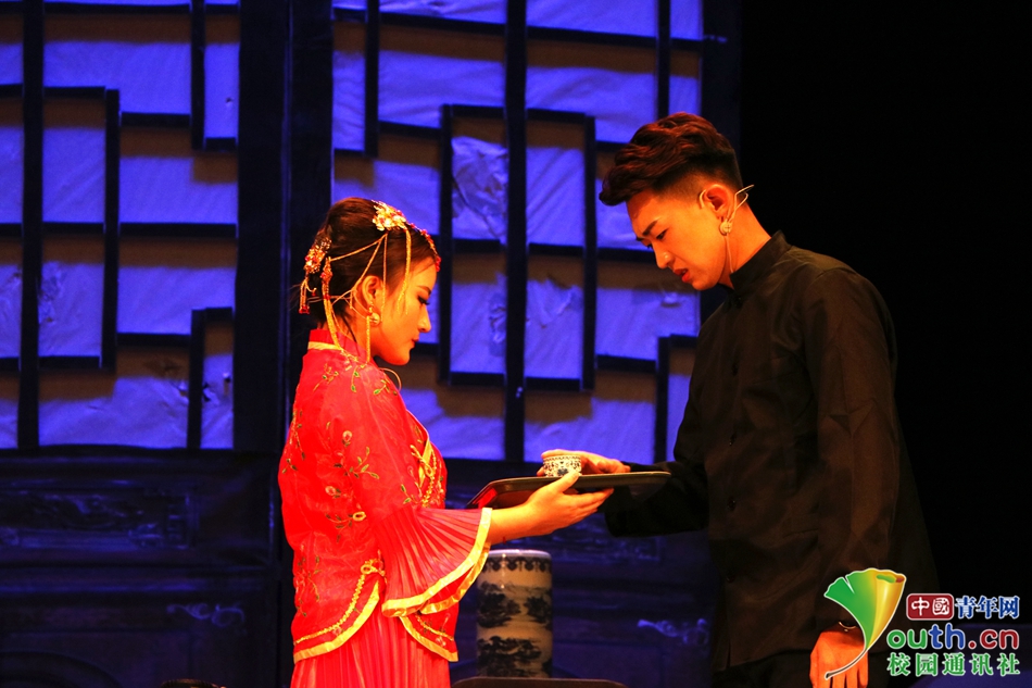 女主角给剧中的丈夫奉茶,男主角欲言又止。 中国青年网通讯员 刘世兰 摄