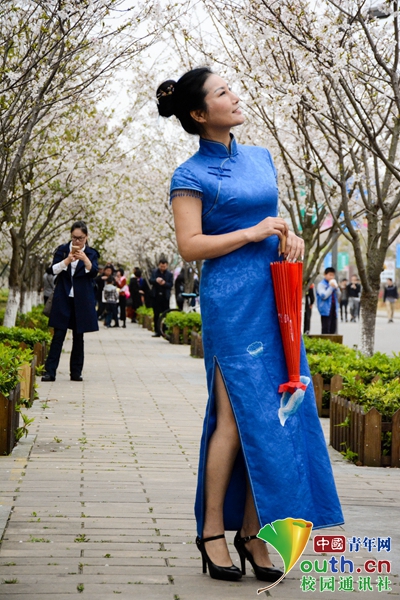 花间驻足,满眼沐浴花色的欣喜,一袭亮蓝色旗袍,微微抬头间是知性与优雅,她在欣赏风景,而在他人眼中,她亦是一道风景。中国青年网通讯员 沈榆 摄