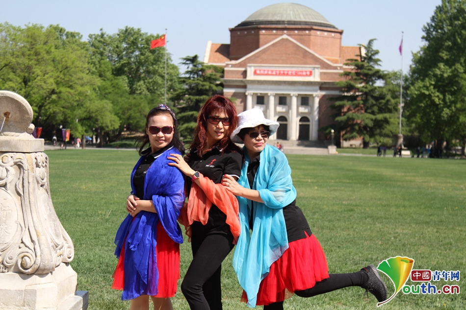 05 校友毕业30周年回校“庆生”。丝巾随风浮动,如今再见面,依旧喜欢一起凹造型拍照片。 中国青年网记者 崔宁宁 摄