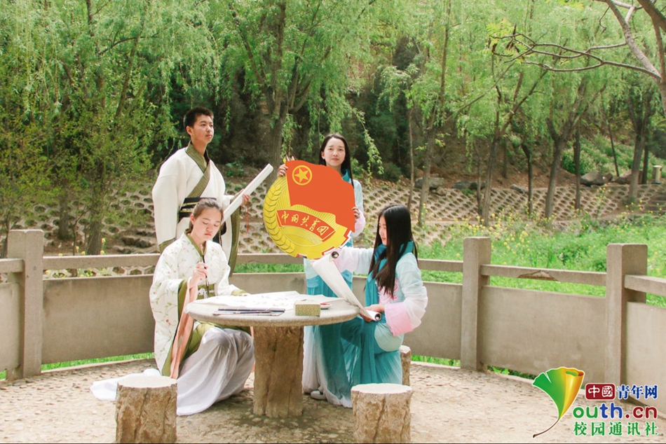 国风书画协会与团徽合影。西安科技大学团委 供图