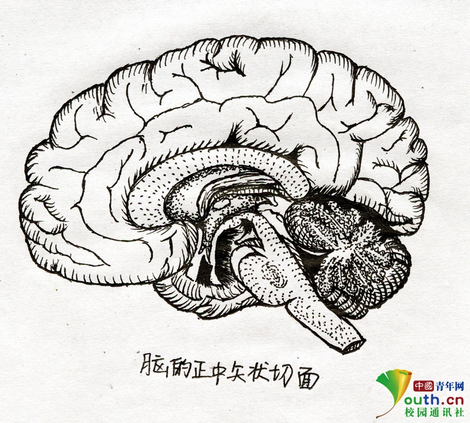 07 脑的正中矢状切面:渊博的人是多么神奇啊,他们的大脑像蜘蛛网,粘住所有知识的小昆虫。而我的大脑是一块西瓜皮,所有的知识一脚踩上,就滑得无影无踪。——刘瑜 《送你一颗子弹》(手绘者 陈晚平)中国青年网通讯员 林加红 摄
