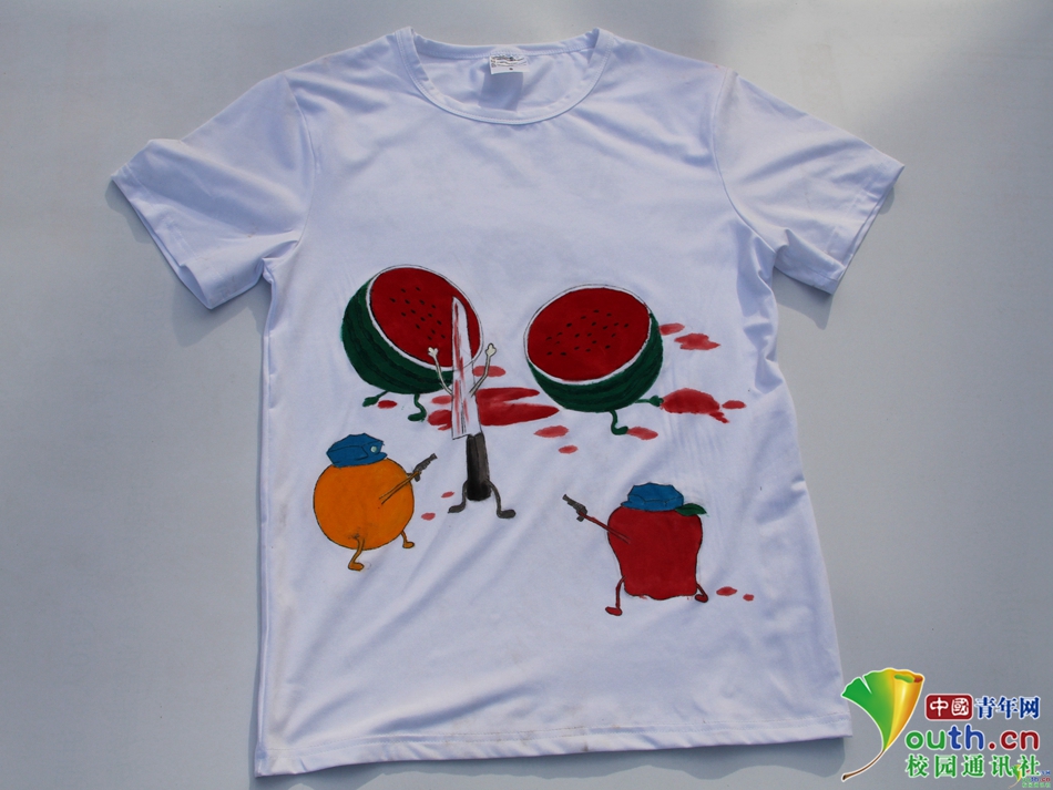 02 看!那个带着警帽拿枪的橘子和红苹果正在“逮捕”刚切了西瓜的染汁小刀。 中国青年网通讯员 廖祥伯 向利芬 摄