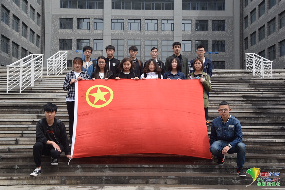 04 内蒙古工业大学的青年学子在本部的科教楼前与团旗合影,他们整齐的站成两排,神情淡定,表达了对团旗深深的敬意。中国青年网通讯员 郭森垚 摄