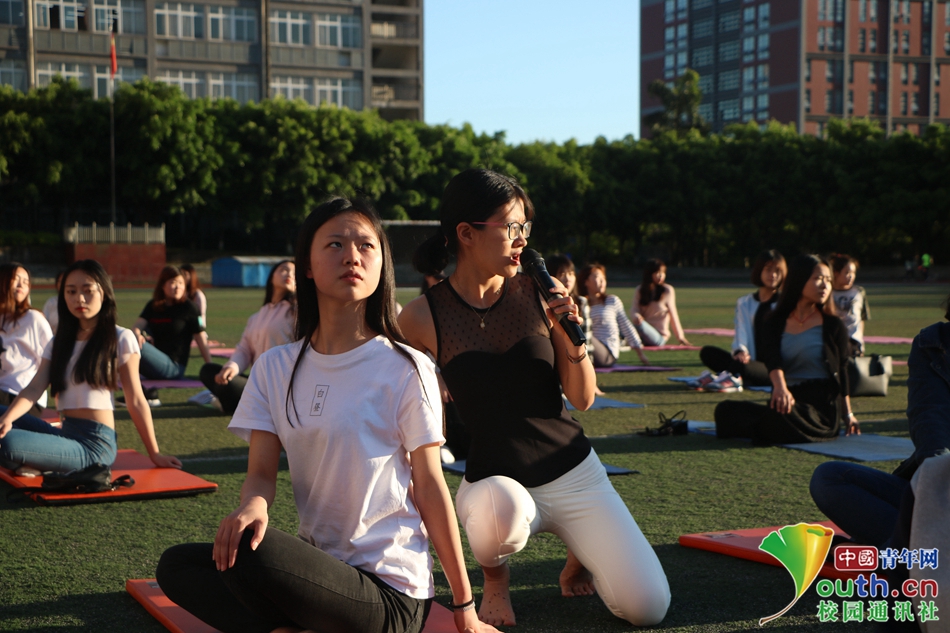 04 瑜伽老师对一名姿势不标准的同学进行耐心的指导,同学虚心受教,即时纠正动作。中国青年网通讯员 李幽璇 摄