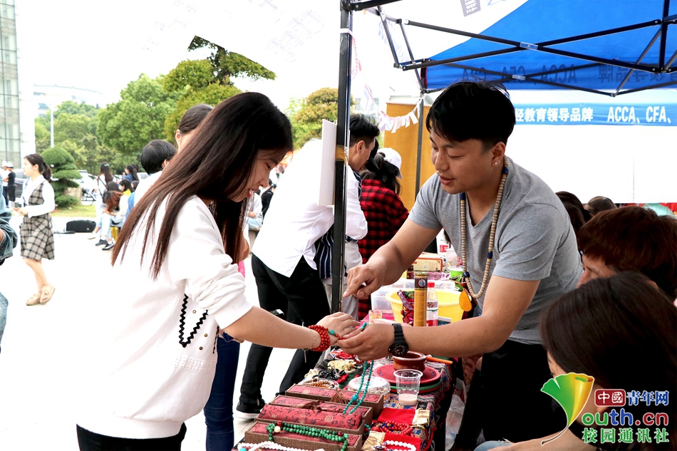 04 藏族展区内,工作人员为前来观看的同学讲解民族服饰。中国青年网通讯员 邓依蓝 摄