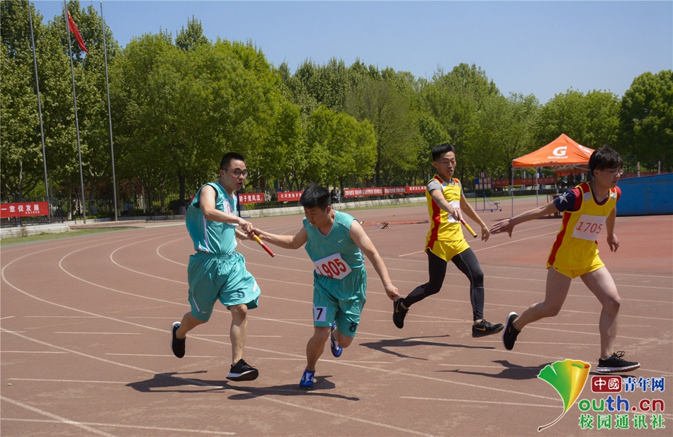 12 环环相扣,传递着团结的精神,参加男子4*100米接力赛的同学接过队友手中的接力棒,同时,他接过的还有全队的希望与期盼。中国青年网通讯员 刘子煜 摄