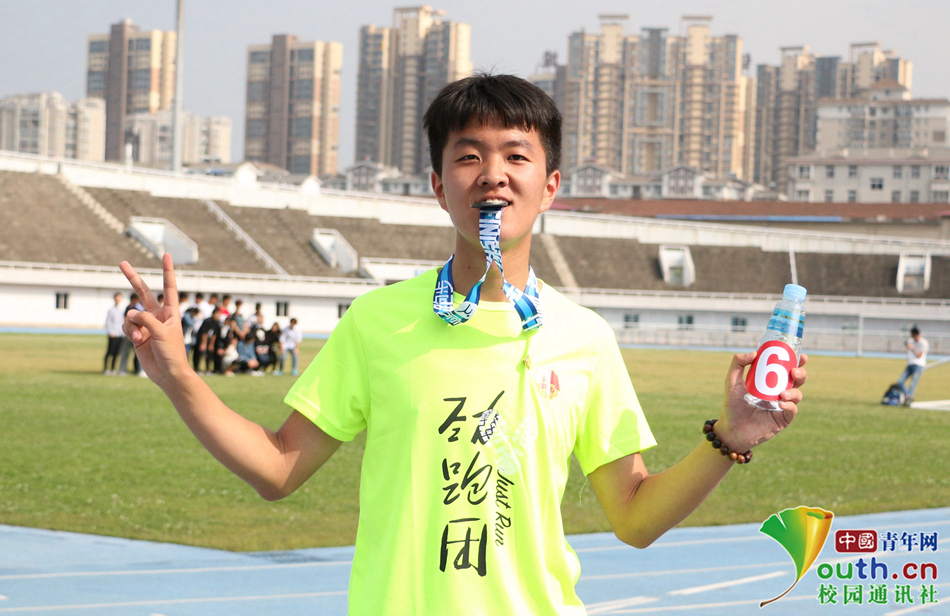一名同学咬着奖牌向大家展示团队号码牌。中国青年网通讯员 周晗逸 提供