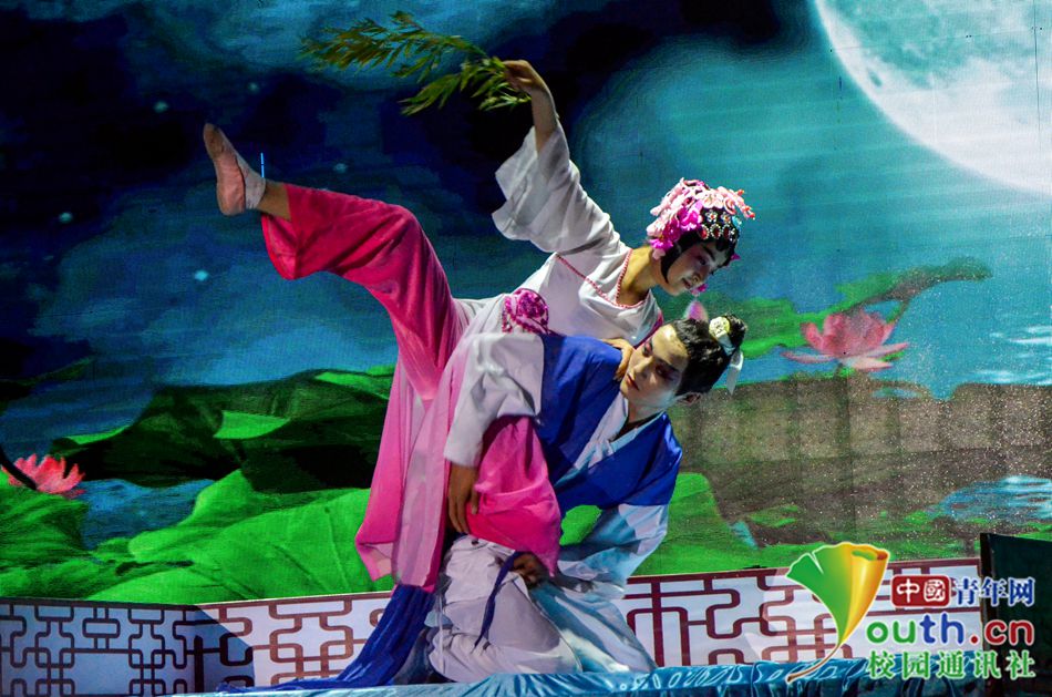 04 杜丽娘回屋后,忽作一梦。梦见一书生手拿柳枝要她题诗,后被那书生抱到牡丹亭畔,共成云雨之欢。中国青年网通讯员 王壮 提供