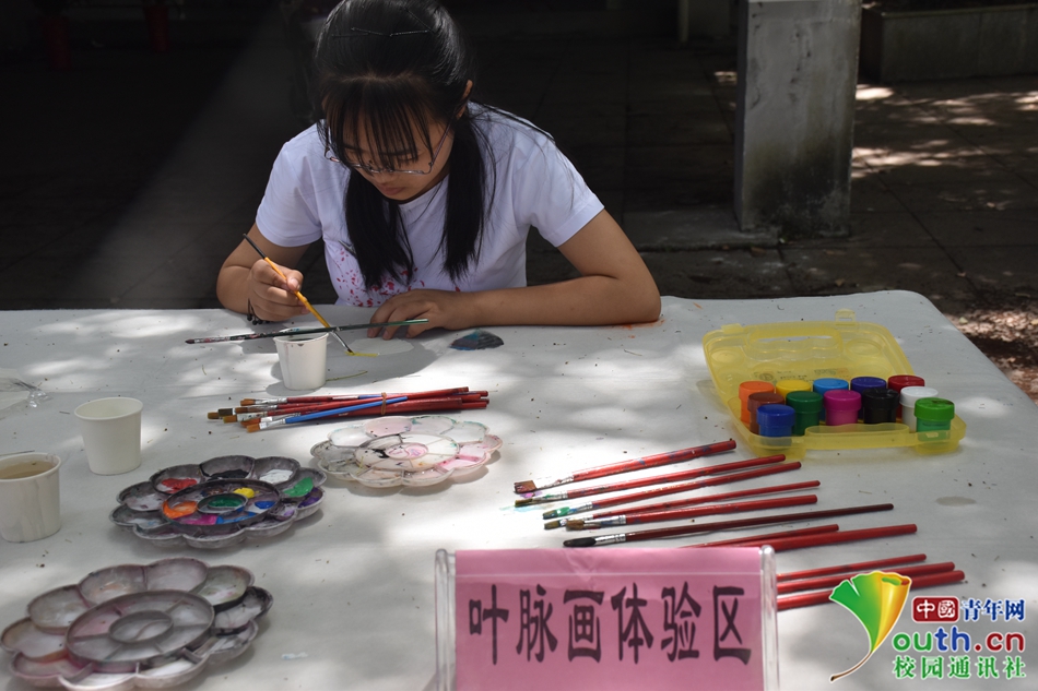 05 小小的叶子也能有丰富多彩的颜色。同学们在叶脉画体验区创作叶脉画。 中国青年网通讯员 朱文莉 摄