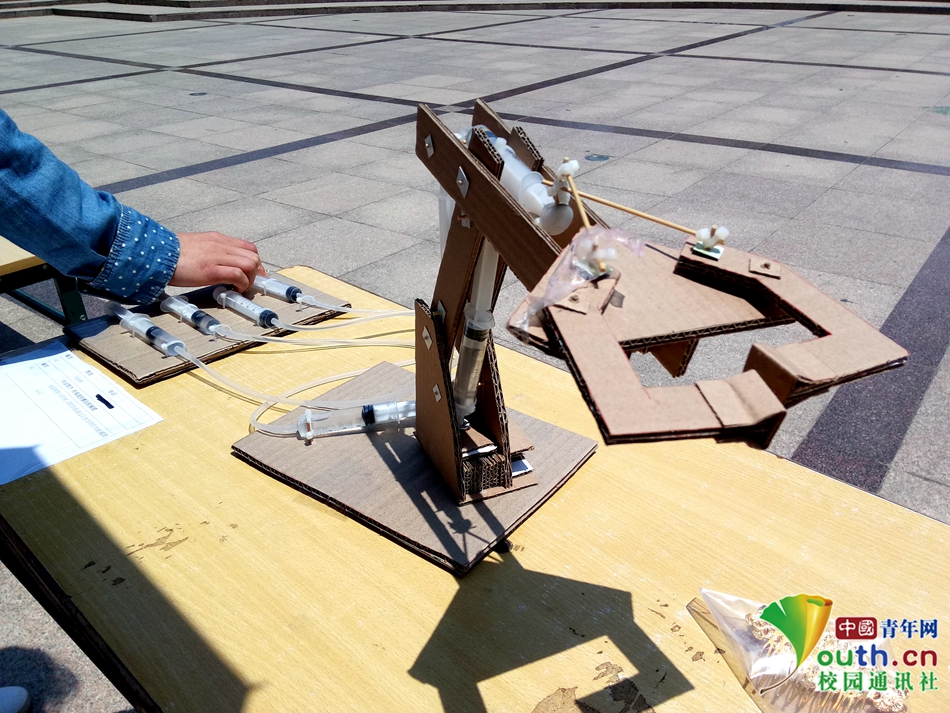 14 作品《有线遥控搬运机械臂》。利用帕斯卡原理,用控制板通过注水导管控制机械臂运动,创意十足。 中国青年网通讯员 程晓琳 摄