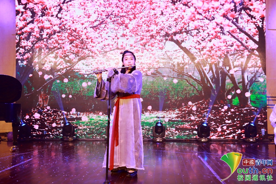 04. 器乐三重奏《春告鸟》,演员身着具有中国传统特色的服装吹出宁静优雅的曲调,观众深深陶醉其中。 中国青年网通讯员 赵梓维 摄