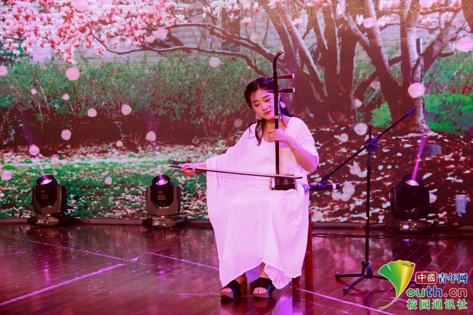 05. 演员身着白色色长裙,用二胡拉出宛转悠扬的曲调,与长笛相互呼应,和谐而动听,使人身心宁静。 中国青年网通讯员 赵梓维 摄