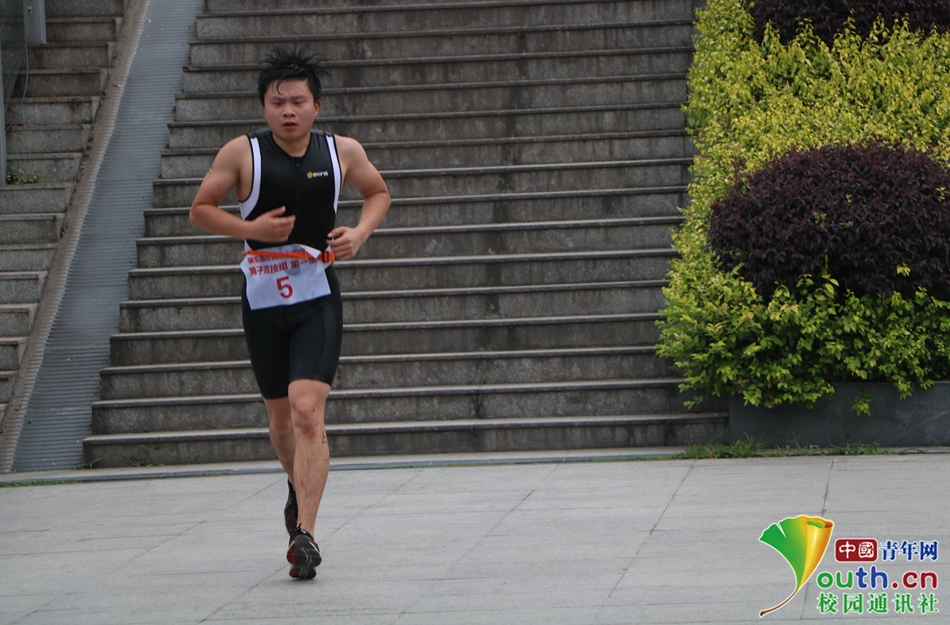 刚刚完成游泳环节的选手,向着自行车赛道起点飞奔而去。中国青年网通讯员 冉旭 摄