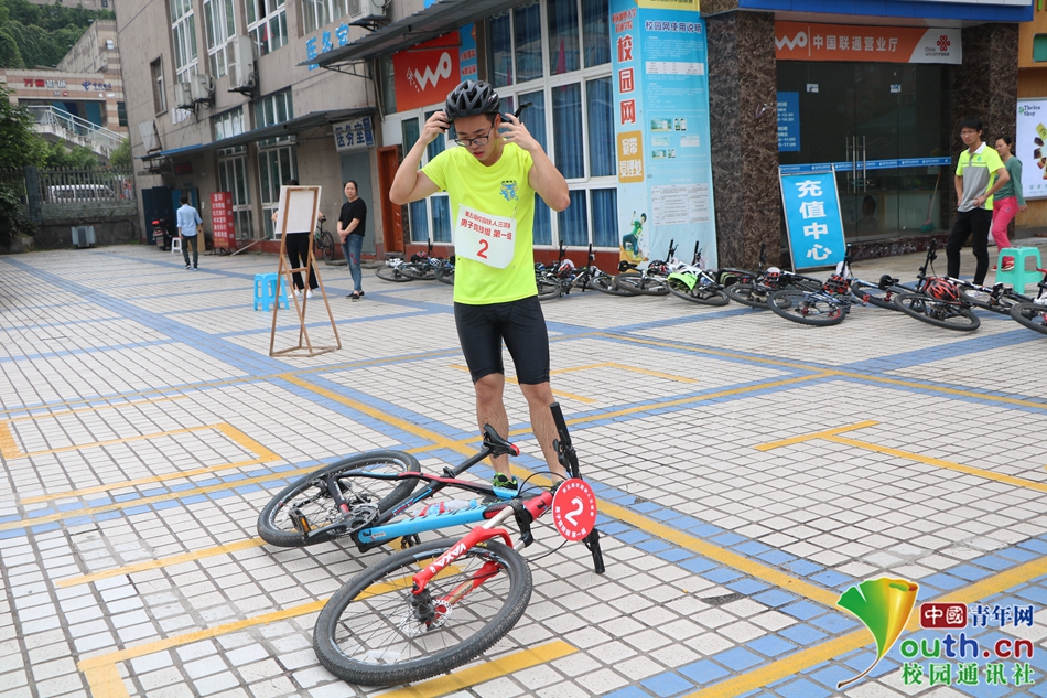 一位选手正戴上头盔准备开始自行车环形环节。中国青年网通讯员 冉旭 摄