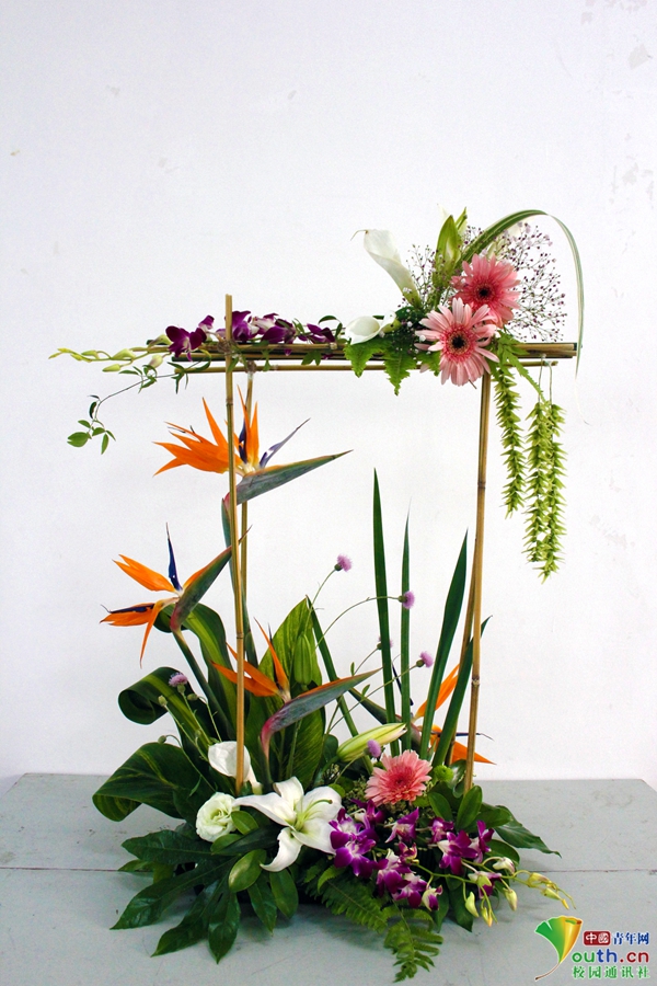 作品“邂逅·自然”采用铁丝围成人物剪影,寓意着在快节奏的生活中,人与人之间就如同这冰冷的铁丝,毫无生气。该作品选用康乃馨为主要花材,代表着热情、真挚心灵的相遇,将其放置其间,仿佛构建起一架自然之桥,让人与自然来了场奇妙的邂逅。中国青年网通讯员 江欣眙 摄