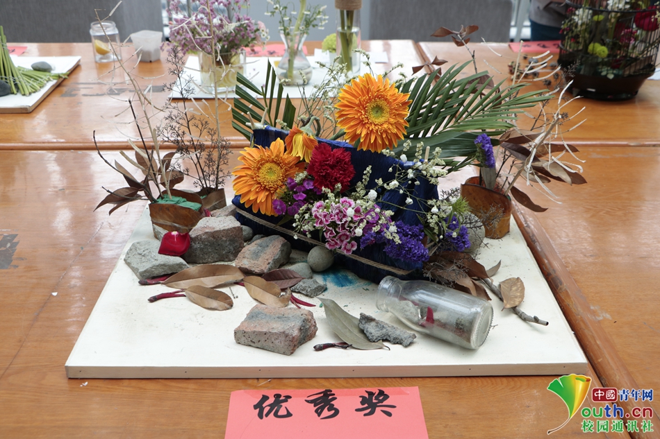 菊、玫瑰、莲藕、枫叶,这些生活中人们触手可及但却很少在意的花草枝木,经过精心的装点、修饰,组合成了作品“生活与枫与情怀”,表达了一种复古的情怀以及对生活的感恩。中国青年网通讯员 江欣眙 摄