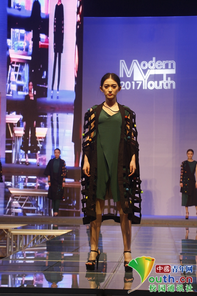 04 设计师王巧灵的《憧憬》系列,将面料用条状的方式编制成网状打造牢笼的效果,同时用五颜六色的小球来代表梦想,表现出思想被束缚,憧憬着冲出自我编织的牢笼。中国青年网通讯员 雷开锋 摄