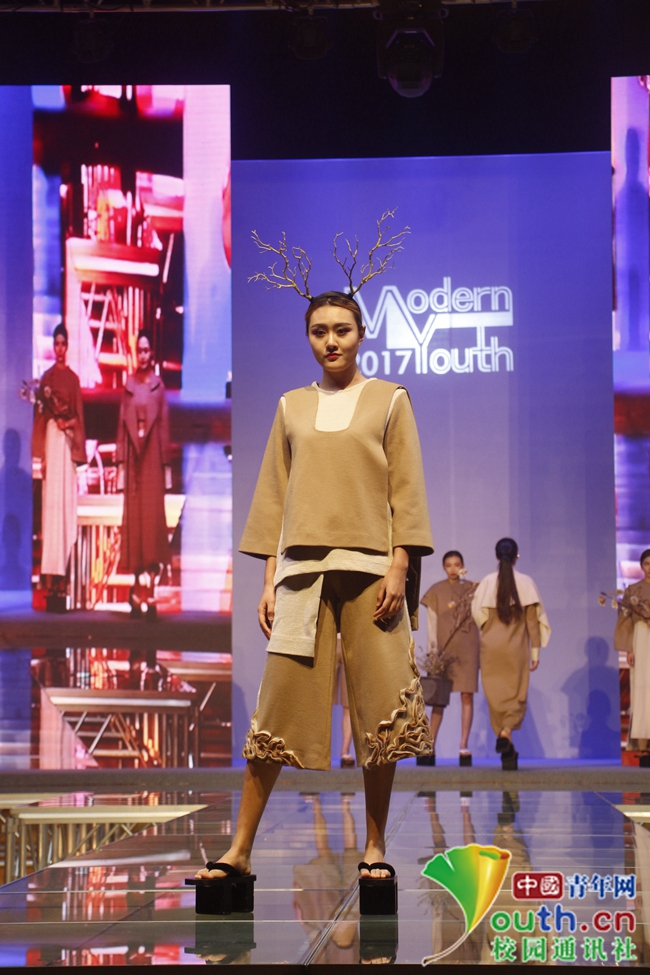 05 设计师张诗桦的《粹空山 木萧然》系列,从大叔的年轮视角去理解生命,运用网纱和欧根纱面料处理年轮的抽象效果融入服装中,将返璞归真的感觉呈现在衣服上。中国青年网通讯员 雷开锋 摄