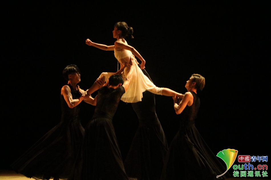 灯光暗下来了,大提琴缓缓的拉着,她想要出去,想逃离这个棋盘,“黑棋”们将她托起,她努力的跑,却怎么也逃不出去。 中国青年网通讯员 苏明瑛 摄