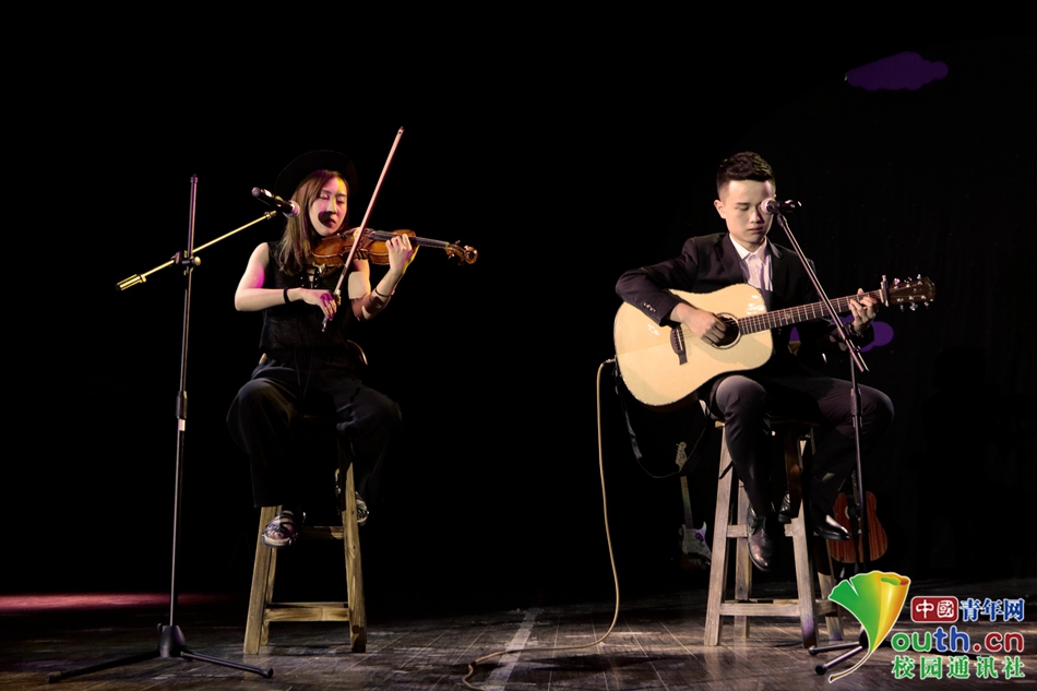 《viva la vida》豁达壮丽的情感,展现了路易十六的人生轨迹,演奏者以此提醒自己不忘初心 。“路易十六本是一个有抱负的君主,最后却因为种种原因变成了一个骄奢淫逸的国王。这是我作为社长带领吉他社举办的第一次专场,是想借这首歌来警示自己,能够不忘初心,在自己的任期里管理好社团。虽然心中有忐忑、畏惧,但是还是会带领社员勇往直前。这首歌也表达了我不忘初心追逐梦想的意志,以及我对社团的忠诚与热爱。”中国青年网通讯员 牟津阳 摄