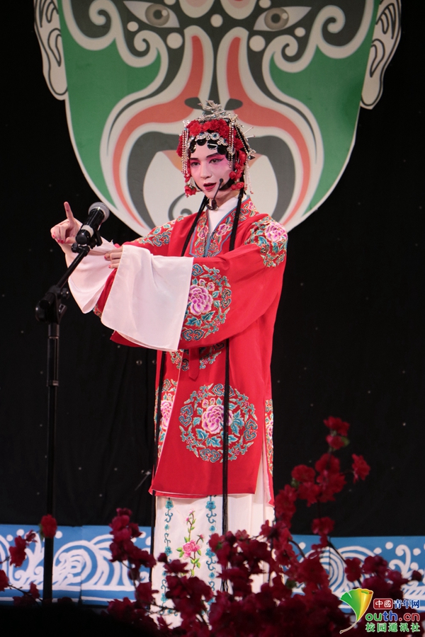 03 京剧程派独居魁首的《锁麟囊》以其声腔和唱词的艺术造就成为戏曲串烧中的压轴戏。“锁麟囊”即指绣有麒麟的荷包,有祈子之意,讲述的是富家女薛湘灵出嫁之日得母赠一“锁麟囊”,途中却恰逢大雨只得在春秋亭中避雨,而后见同日出嫁的贫女赵氏排场之寒酸,自怜卑贱,悲从中来,故而啼哭。选段——“春秋亭”一折,将一个千金小姐的锦心绣口表现得韵味十足。中国青年网通讯员 赵颖丽 摄