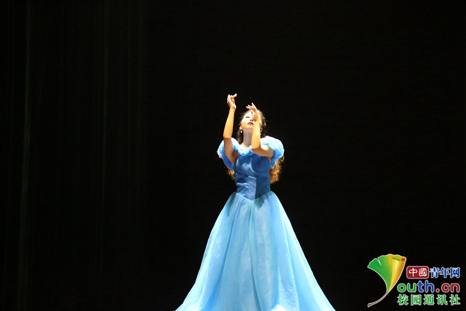 台上灯光柔和,身着蓝色裙子的姑娘在舞台上翩翩起舞,如仙女,似蝴蝶,犹碧玉。 中国青年网通讯员 李幽璇 摄