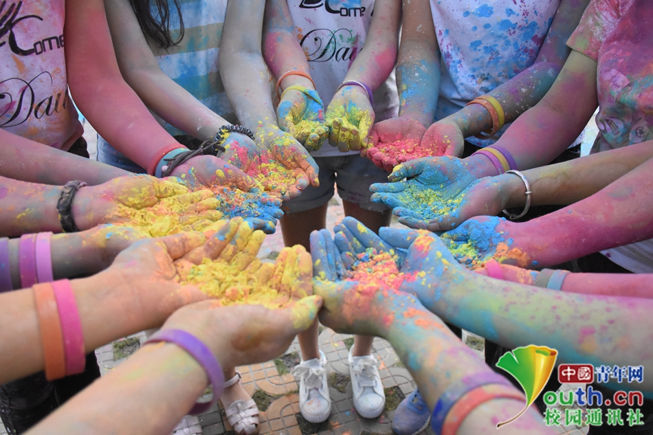 彩色区的工作人员手捧五色玉米粉向参与者撒播彩粉,以示祝福。区内人员立马变成色彩缤纷的调色板,阳光下的赛道正在举行一场五彩派对。中国青年网通讯员 吴丽华 摄