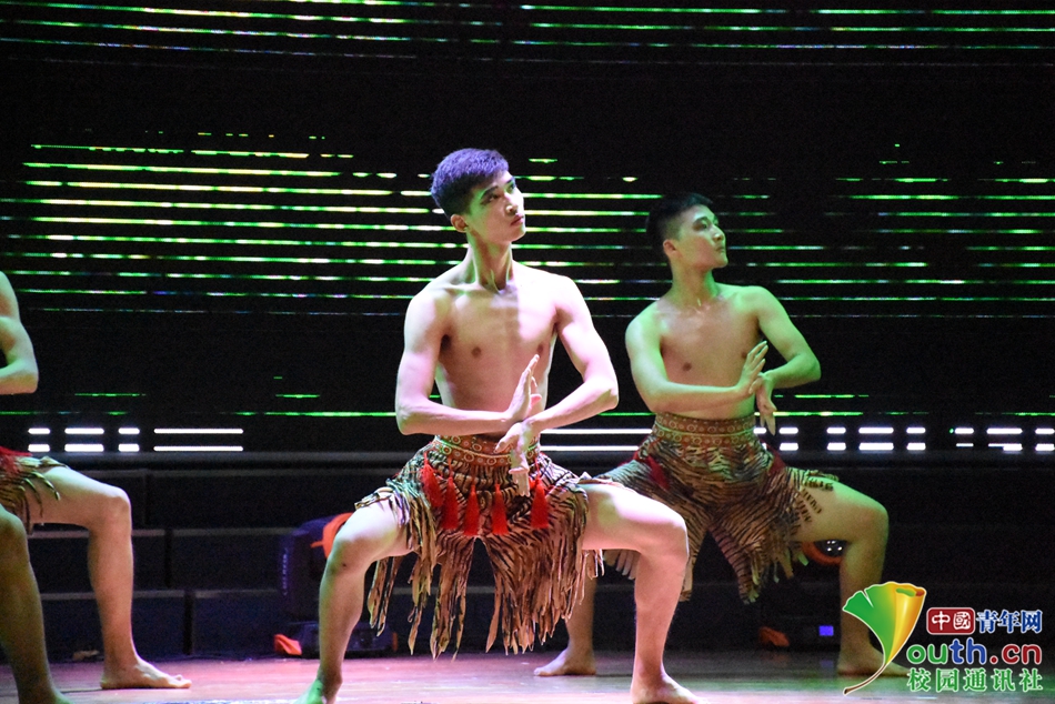 05 群舞《草原汉子》,双臂向两侧平伸,曲肘上举,双腿叉开,屈膝半蹲,用熟练的舞姿展示出草原汉子的英勇气概。中国青年网通讯员 梁小妹 摄