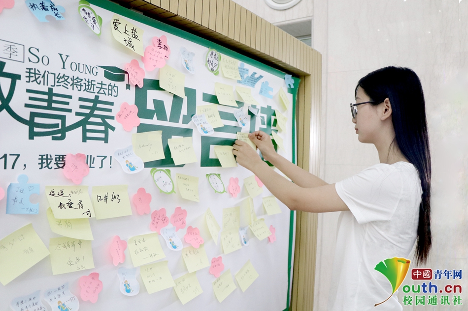 02 把自己的祝福贴到毕业留言墙上。中国青年网通讯员 华欣 摄